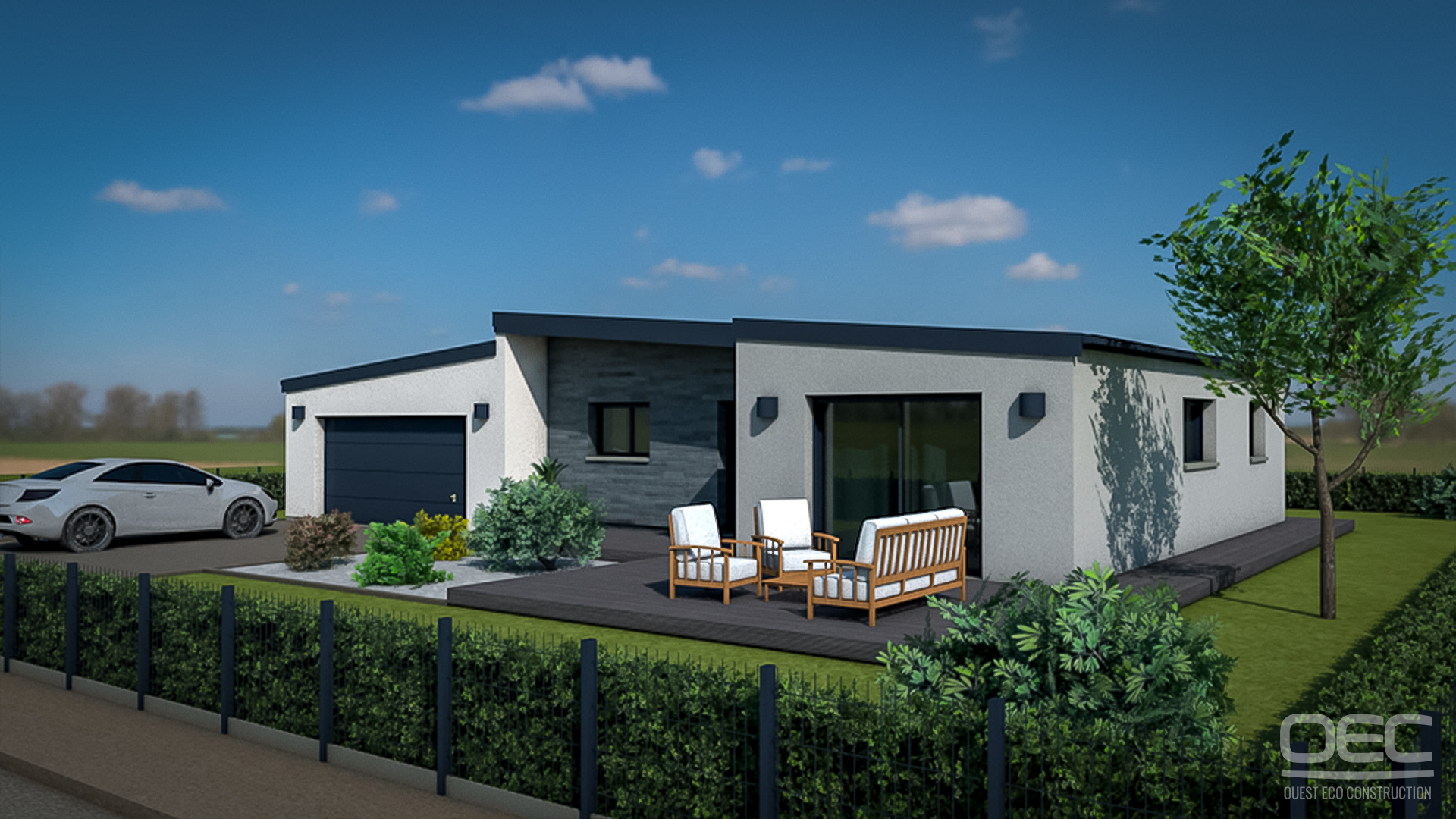 Cette maison comprend une pièce de vie de 40 m² avec une cuisine ouverte, trois chambres, une salle d'eau, des toilettes séparées, un garage de 40 m².